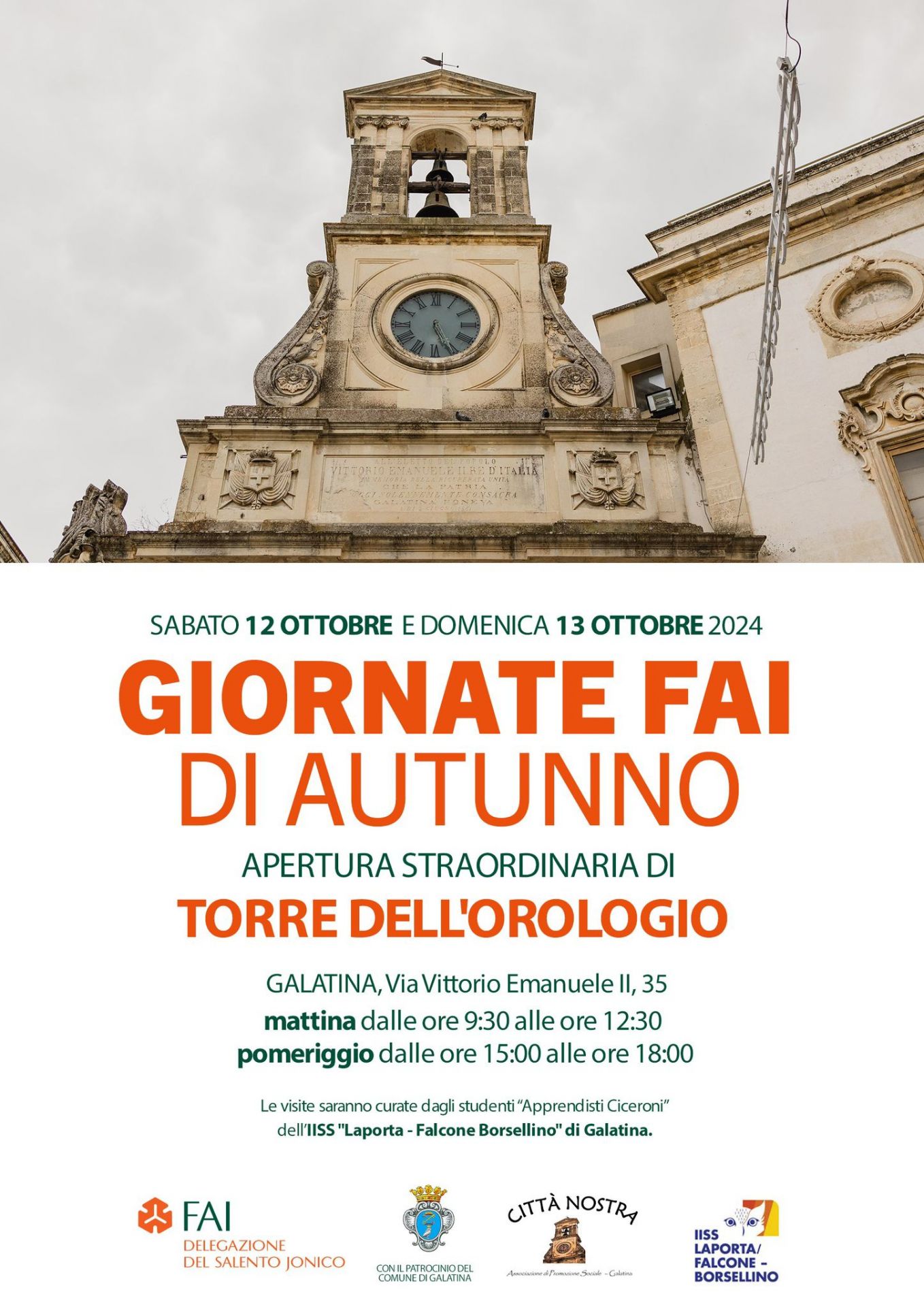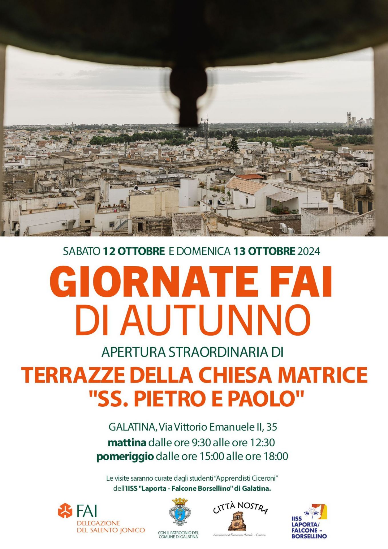 Gentili docenti, genitori e cari studenti dell'IISS “Laporta/Falcone-Borsellino”, è con grande piacere che vi invito a partecipare alle “Giornate FAI di autunno” del 12 e 13 ottobre 2024 a Galatina.