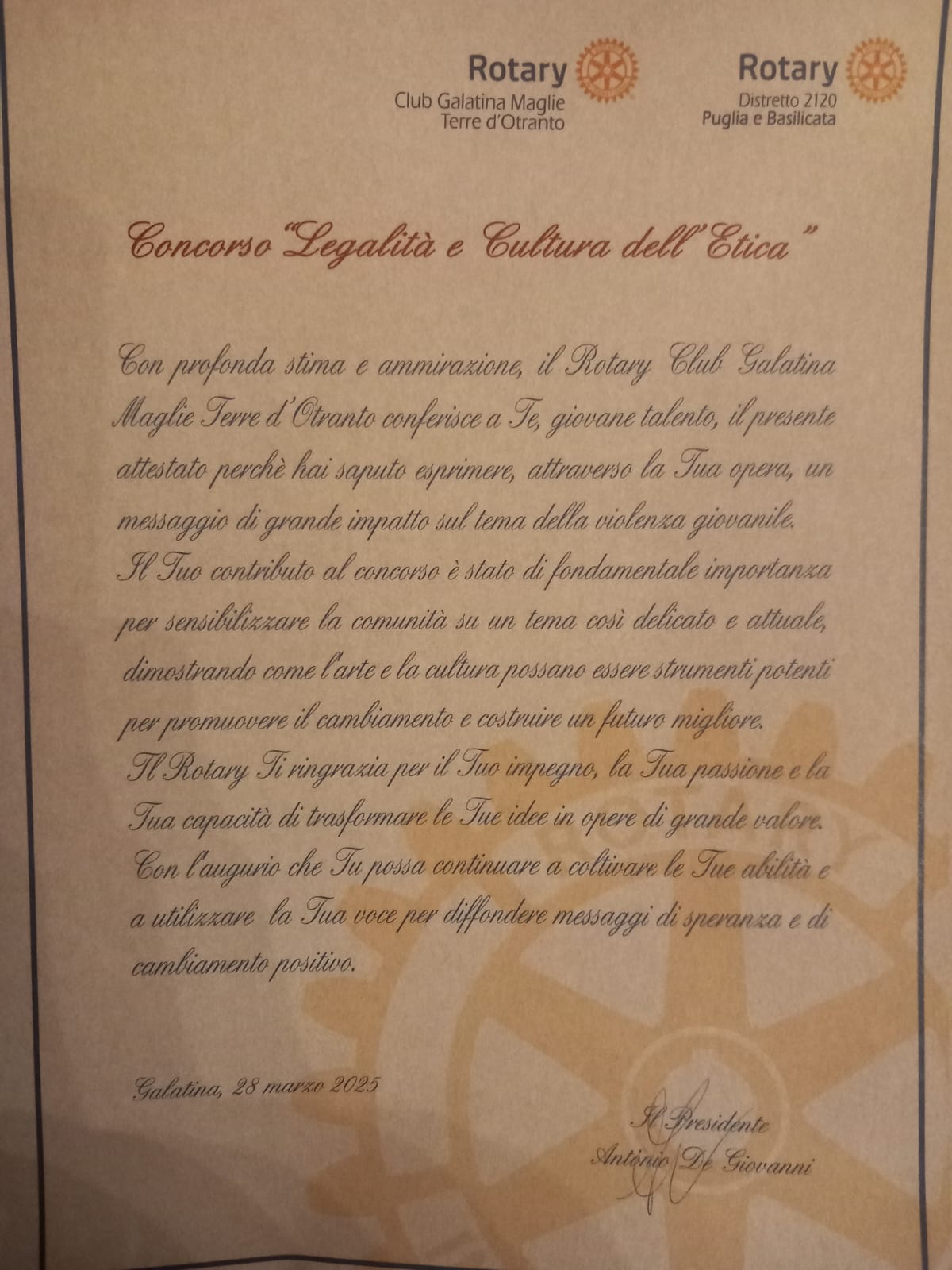 Lo scorso 28 marzo, presso il Teatro "Cavallino Bianco" di Galatina, alla presenza di autorevoli relatori, sono stati premiati gli elaborati più significativi prodotti dagli studenti partecipanti sul tema "Violenza giovanile: prevenzione e contrasto".