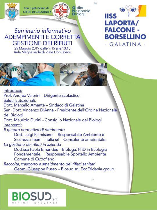 Sabato 25 maggio 2019, a partire dalle ore 09:15, presso l’Aula Magna dell’I.I.S.S. di Viale Don Bosco, si terrà un Seminario sul tema “Adempimenti e corretta gestione dei rifiuti”.